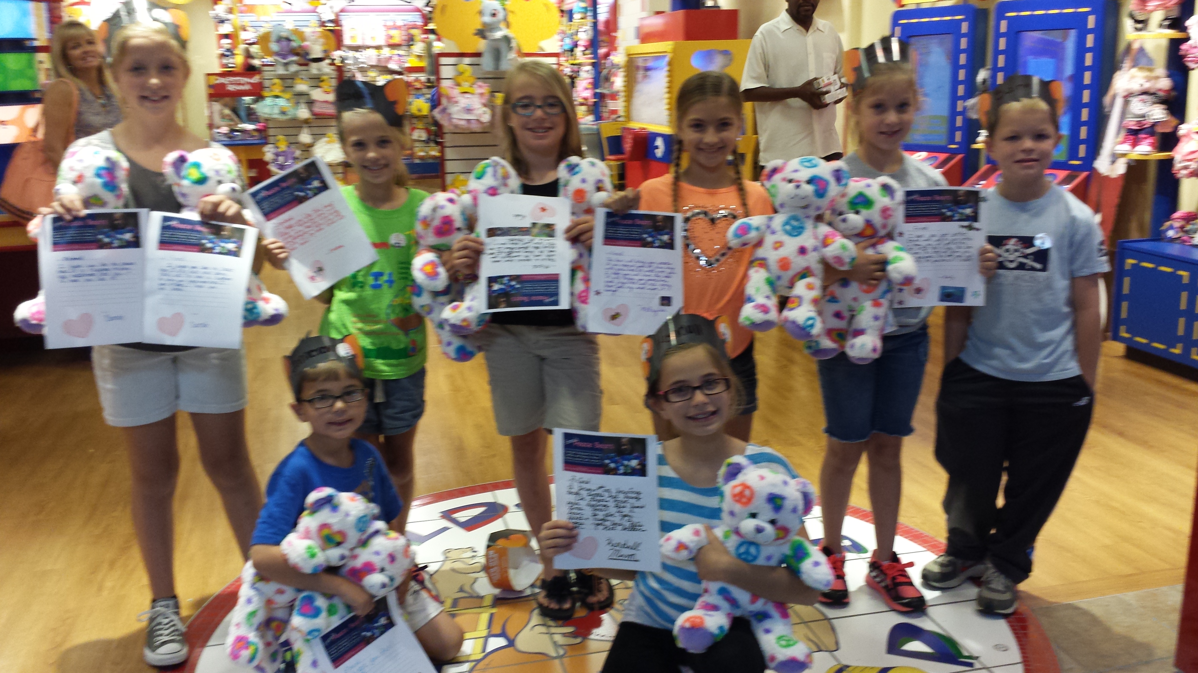 Dani’s Dreams Club members partnered with New Palestine Elementary fourth grader Emma Mann to build a dozen bears for her Peace Bear Project Fri. Oct 11 at the Castleton Build A Bear Workshop. Dani’s Dreams Outdoor Education Center received a grant from the Hancock Regional Hospital Foundation to purchase the bears that will be given to patients at the new Hancock Regional Cancer Center. Build A Bear also donated 10 Peace Bears to be distributed at the Hancock Regional Cancer Center. In addition to building the white Peace Bears, the students, from Sugar Creek and New Palestine elementary schools, including Emma, her sister Kendall, brother Cameron, friends Sadie Miller and McKaylah Flagle, and Dani’s Dreams Club members Sarah, Emily and Sam Adam wrote letters to the patients and will be delivering the bears personally.