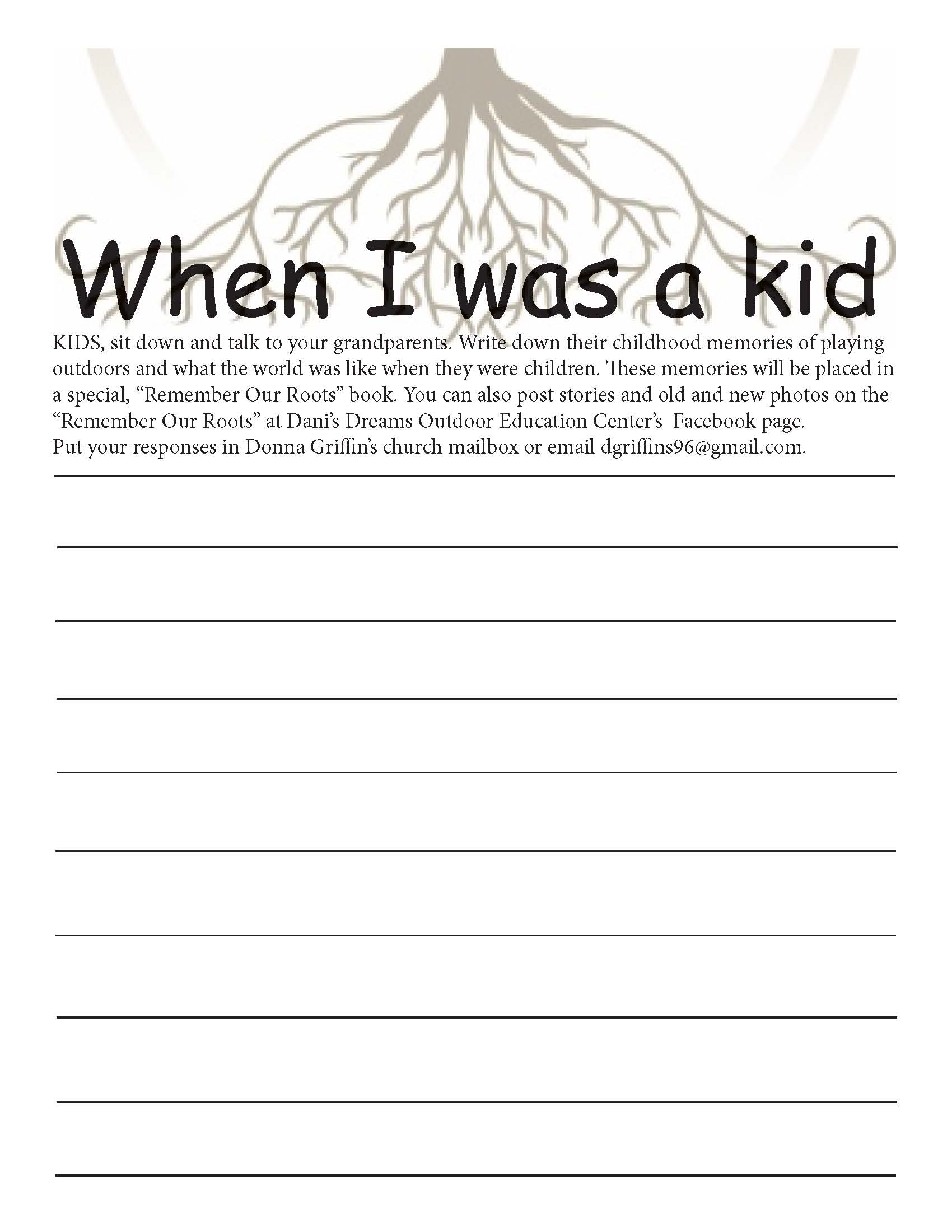 Kids, don’t forget to talk to your grandparents and get their stories for our “Remember Our Roots” memory book. We are compiling childhood memories and stories over this year. Send them to Zion Lutheran School, in c/o Dani’s Dreams or post them online at the Remember Our Roots at Dani’s Dreams Outdoor Education Center’s Facebook Page.