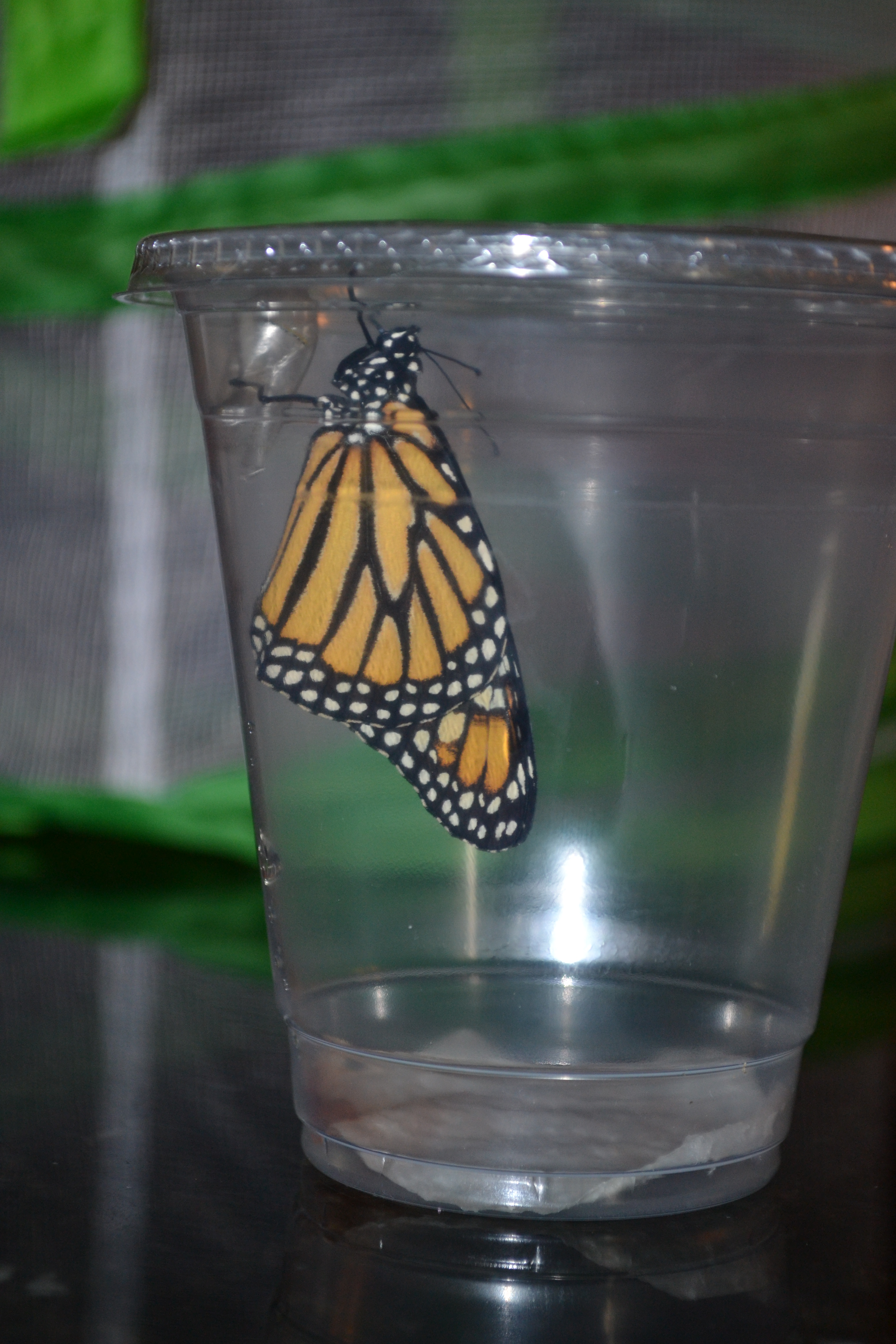 Catching the caterpillar changing into a chrysalis is the fun stage. The caterpillar will climb up to the lid of the cup and spin a silk structure to attach itself.